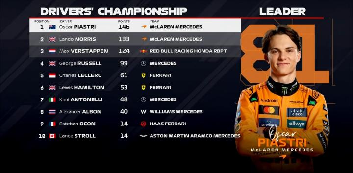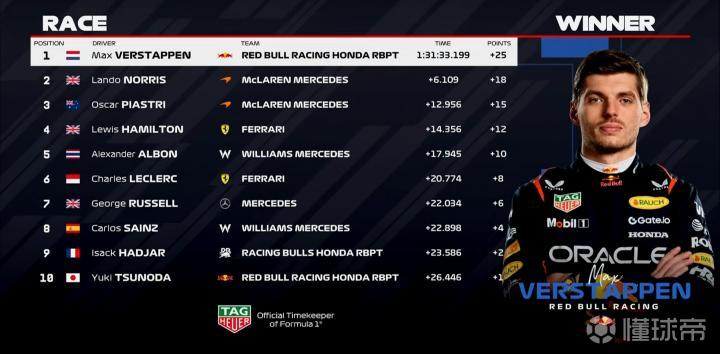 第1-第5:维斯塔潘、诺里斯、皮亚斯特里、汉密尔顿、阿尔本