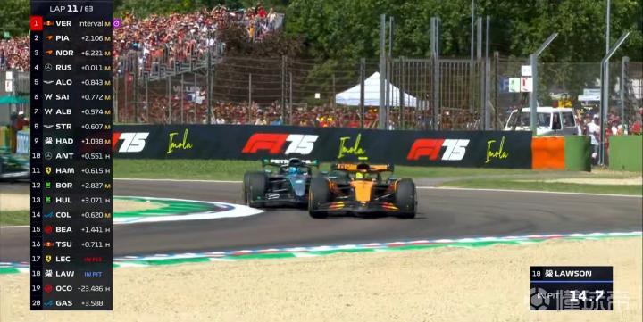 第11圈:诺里斯在维伦纽夫弯强硬完成超越,勒克莱尔主动求变进站一停;