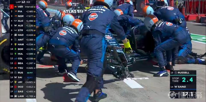 第12圈:拉塞尔、威廉姆斯执行一停,回应勒克莱尔的undercut;