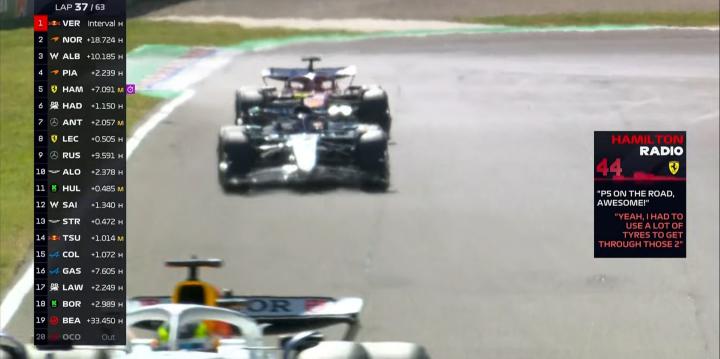 第37圈:Ricky表扬了汉密尔顿的发挥,汉密尔顿表示自己在刚才的2次超越中用了不少轮胎;