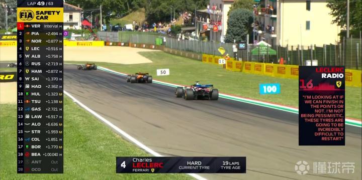 第49圈:勒克莱尔表示目前的这套轮胎将在重启后非常吃亏,很难坚持到结束;
