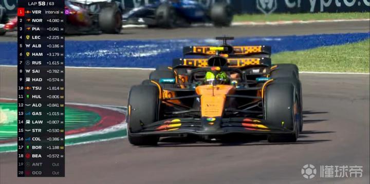 第58圈:诺里斯在2号弯强硬超越队友上升到第2,现在的剧情与去年的最后几圈很像,依旧是诺里斯尝试追击维斯塔潘!