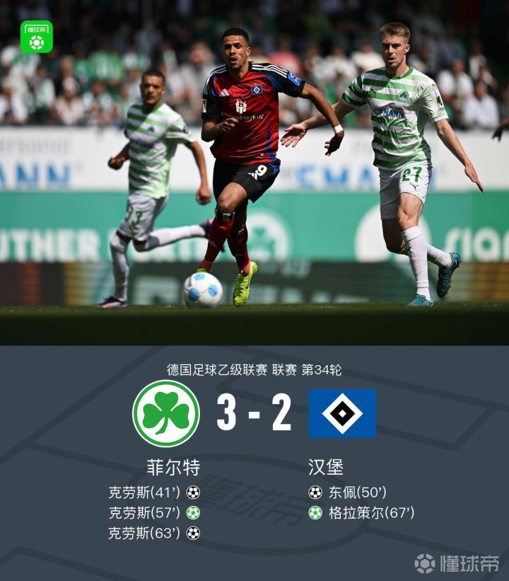 北京时间5月18日,德国足球乙级联赛第34轮,菲尔特主场迎战汉堡。比赛中,菲尔特的克劳斯表现出色,完成帽子戏法。汉堡方面,东佩打入一球,格拉策尔通过点球机会破门。最终,汉堡2-3不敌菲尔特,积分榜被科隆反超,屈居德乙亚军。