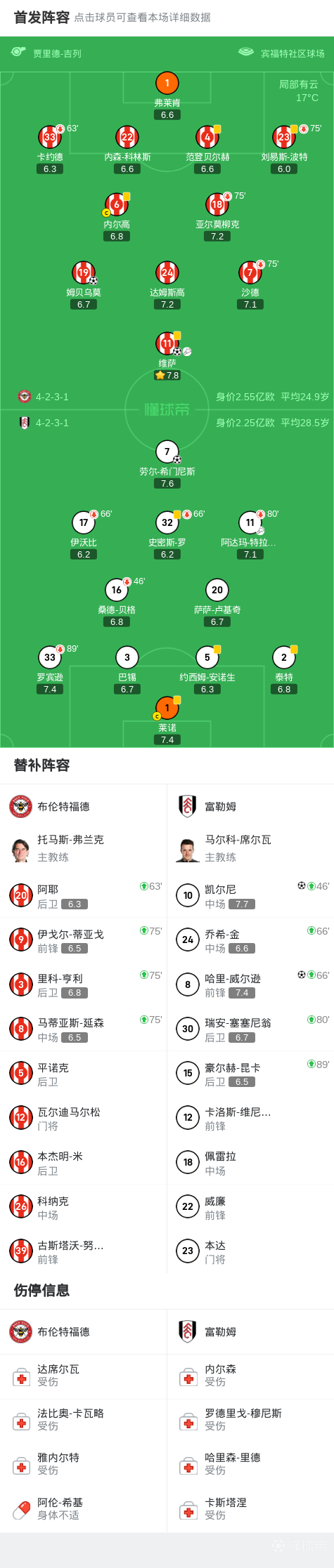 第43分钟,维萨门前抢射得手,布伦特福德2-1富勒姆