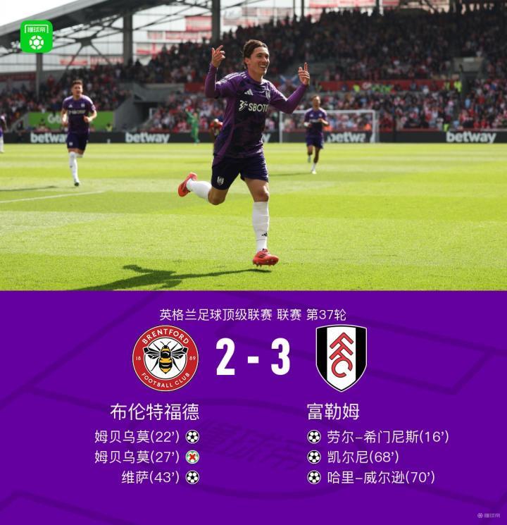 北京时间5月18日,英超联赛第37轮,布伦特福德主场迎战富勒姆。上半场,劳尔-希门尼斯头球破门先拔头筹,维萨助攻姆贝乌莫扳平比分,随后姆贝乌莫主罚点球被莱诺扑出,此后,维萨铲射空门一度完成反超;下半场,凯尔尼头球破门扳平比分,哈里-威尔逊轰出精彩世界波锁定胜局。最终,富勒姆客场3-2力克布伦特福德。