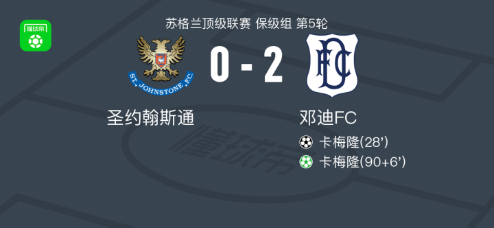 北京时间5月18日,苏格兰顶级联赛保级组第5轮,圣约翰斯通主场迎战邓迪FC。比赛中,邓迪FC的卡梅隆表现出色,他先是接到西蒙-穆雷的助攻打入一球,随后又在补时阶段通过点球完成梅开二度。最终,圣约翰斯通0-2不敌邓迪FC。