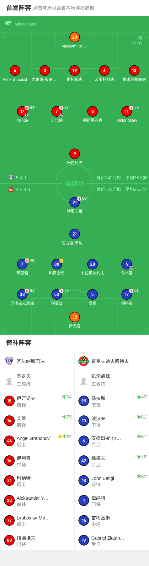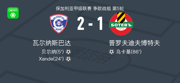 北京时间5月18日,保加利亚甲级联赛争欧战组第5轮,瓦尔纳斯巴达主场迎战普罗夫迪夫博特夫。比赛中,瓦尔纳斯巴达凭借贝尔纳和Xande的进球取得领先。普罗夫迪夫博特夫由乌卡基打入一球缩小分差。最终,瓦尔纳斯巴达以2-1战胜普罗夫迪夫博特夫。
