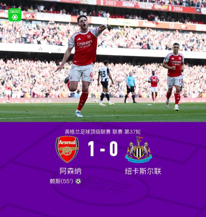 英格兰足球超级联赛第37轮,阿森纳主场迎战纽卡斯尔联。比赛中,赖斯凭借厄德高的助攻成功取得进球,为阿森纳打破僵局。最终,阿森纳以1-0战胜纽卡斯尔联,全取三分。