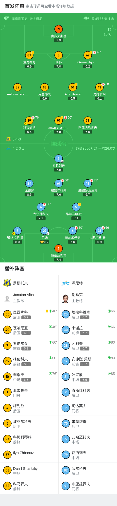 泽尼特1-0罗斯托夫,索鲍列夫助球队取胜战报bot @懂球帝2025-05-19 02:02北京时间5月19日,俄罗斯足球超级联赛第29轮,罗斯托夫主场迎战泽尼特。比赛中,泽尼特由索鲍列夫完成进球,为球队取得领先。最终,罗斯托夫0-1不敌泽尼特。点击查看本场比赛详细数据>>点击查看俄超完整积分榜>>精彩瞬间第30分钟,泽尼特球员尼诺助攻索鲍列夫打入一球。 球队阵容 技术统计 展开更多