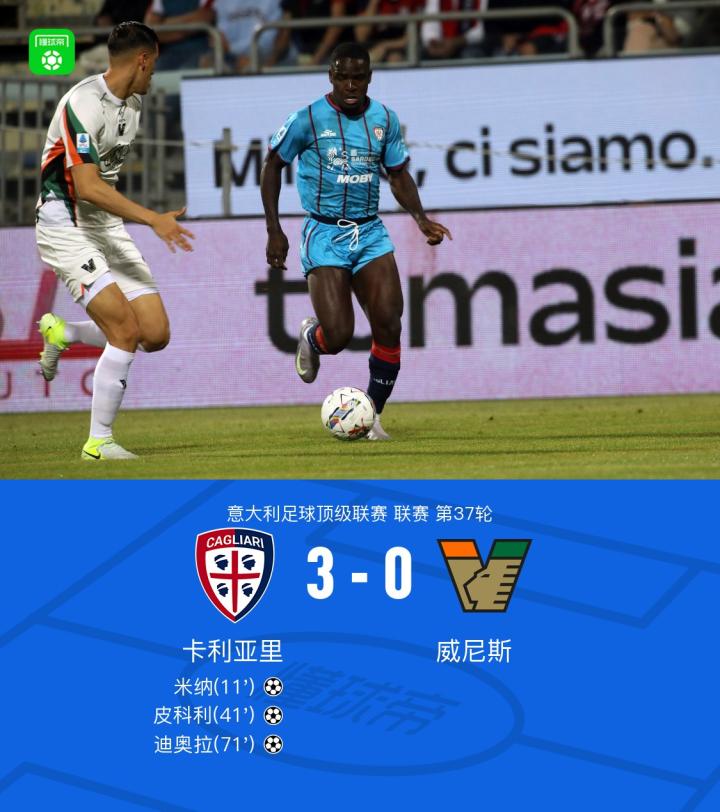 卡利亚里3-0大胜威尼斯,迪奥拉、皮科利建功