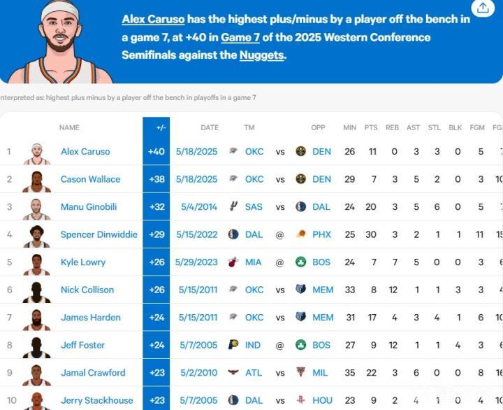 值得一提的是,除卡鲁索外,另一位雷霆的替补球员卡森-华莱士也拿到了+38的正负值,他排在卡鲁索后成为第二高的替补球员正负值纪录保持者。