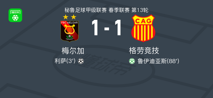 北京时间5月19日秘鲁足球甲级联赛 春季联赛 第13轮,梅尔加主场对阵格劳竞技。梅尔加利萨破门。格劳竞技鲁伊迪亚斯破门。最终比分梅尔加 1-1 格劳竞技。