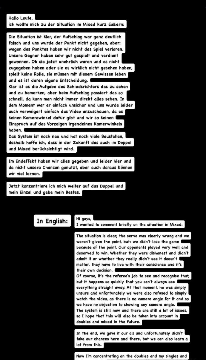 德国组合认为帕瓦德发球错区,但是这个不在挑战范围内,加上裁判驳回了德国组合看回放的申请,导致德国组合无处维权。