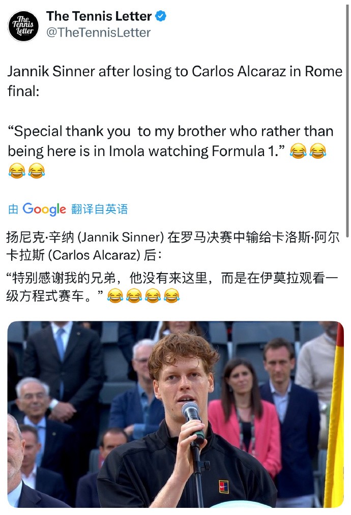 辛纳颁奖典礼调侃哥哥:他没来现场,宁可去伊莫拉看F1比赛gaoniu @懂球帝2025-05-19 14:225月19日凌晨,ATP罗马大师赛决赛,阿尔卡拉斯直落两盘击败世界第一辛纳。颁奖典礼上,辛纳颁奖典礼调侃哥哥:他没来现场,宁可去伊莫拉看F1比赛。辛纳的哥哥马克比他大3岁,出生于俄罗斯,在9个月大的时候被辛纳父母收养。之前报道称他现在是在消防队当教官,没有从事体育工作。 展开更多