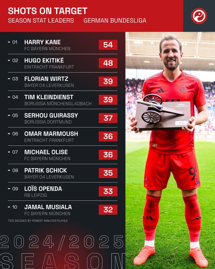 54次射正进26球,凯恩是本赛季德甲唯一一个射正50+次的球员