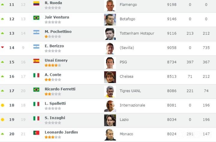 排在榜单第11至第20位的依次是鲁埃达(弗拉门戈)、雅伊尔-文图拉(博塔弗戈)、波切蒂诺(热刺)、贝里索(塞维利亚)、埃梅里(巴黎圣日耳曼)、孔蒂(切尔西)、里卡多-费雷蒂(墨西哥老虎)、斯帕莱蒂(国米)、西蒙尼-因扎吉(拉齐奥)、雅尔丁(摩纳哥)。