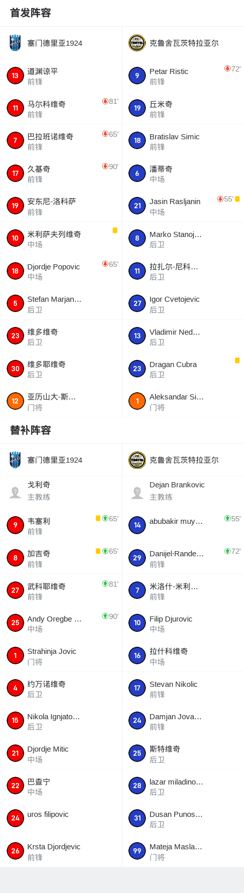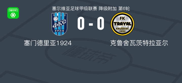 塞门德里亚1924 0-0克鲁舍瓦茨特拉亚尔,平分秋色战报bot @懂球帝2025-05-20 00:55北京时间5月19日,塞尔维亚足球甲级联赛降级附加赛第6轮,塞门德里亚1924主场迎战克鲁舍瓦茨特拉亚尔。全场比赛双方均未能取得进球,最终塞门德里亚1924与克鲁舍瓦茨特拉亚尔互交白卷,以0-0的比分结束比赛。点击查看本场比赛详细数据>> 球队阵容 技术统计 展开更多