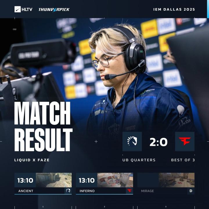 IEM达拉斯:FaZe 0-2不敌液体,s1mple回归首秀一绿带四红