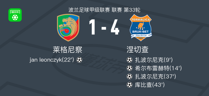 北京时间5月20日,波兰足球甲级联赛第33轮,莱格尼察主场迎战涅切查。比赛中,涅切查展现了强大的进攻实力,扎波尔尼克两次洞穿对手球门,希尔布雷赫特和库比查各贡献一粒进球。莱格尼察方面,jan leonczyk成功打入一球,为主队挽回些许颜面。最终,莱格尼察以1-4不敌涅切查。