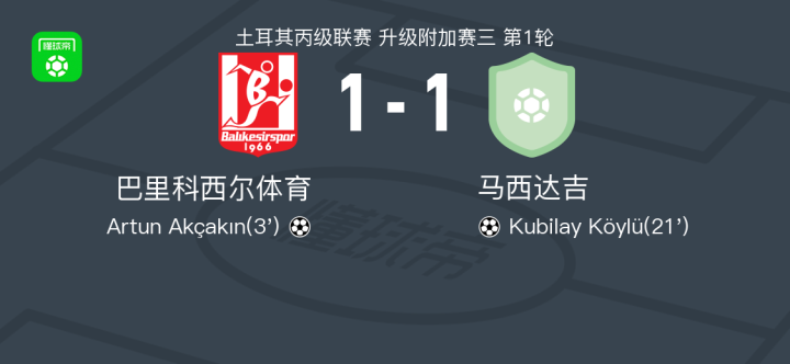 北京时间5月20日,土耳其丙级联赛升级附加赛第三轮第1轮,巴里科西尔体育主场迎战马西达吉。比赛中,巴里科西尔体育由Artun Akçakın取得进球,马西达吉则凭借Kubilay Köylü的进球扳平比分。最终,双方以1-1的比分结束常规时间,比赛将进入加时赛。
