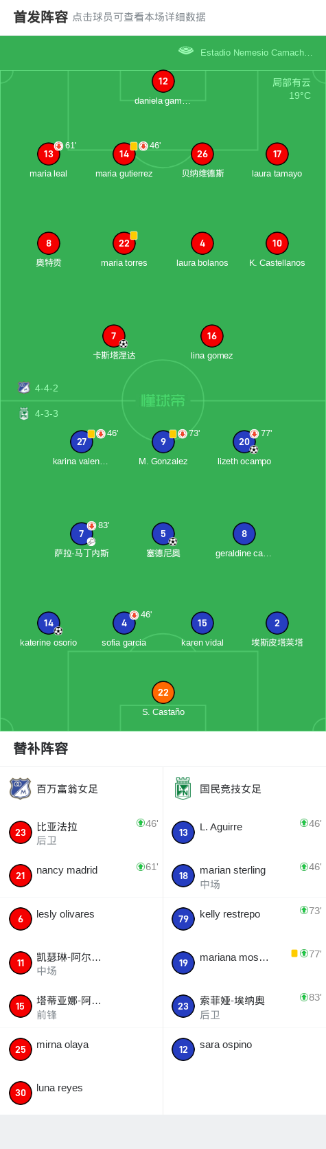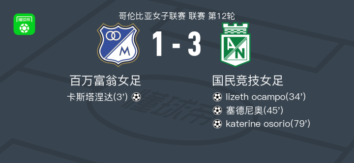 北京时间5月20日,哥伦比亚女子联赛第12轮,百万富翁女足对阵国民竞技女足。比赛中,百万富翁女足由卡斯塔涅达率先取得进球。国民竞技女足方面,lizeth ocampo、塞德尼奥相继破门,随后katerine osorio在萨拉-马丁内斯的助攻下再入一球。最终,百万富翁女足1-3不敌国民竞技女足。