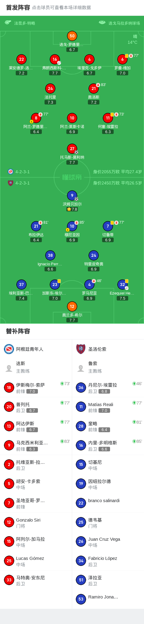 第69分钟,圣洛伦索球员Ezequiel Herrera助攻沃姆贝加尔打入一球。