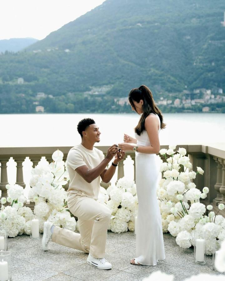 去年7月,29岁的沃特金斯在意大利科莫湖向28岁的艾莉浪漫求婚。当时,沃特金斯单膝跪地,求婚场景位于装饰着如雪般花朵的美丽阳台,二人皆身着白色服装,艾莉在社交媒体上分享了这一完美时刻。