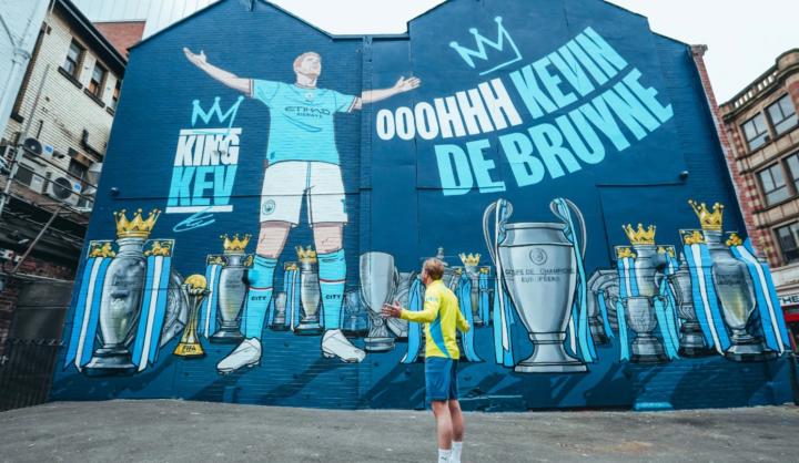 根据曼城官方的公告,这幅壁画位于北区的托马斯街和高街的拐角处,十分醒目,壁画展示了德布劳内在曼城效力期间赢得的每一个奖杯,并将一直保留至5月28日。