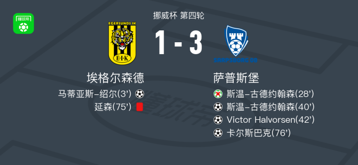 埃格尔森德与萨普斯堡在挪威杯第四轮展开较量。比赛开始后,埃格尔森德凭借马蒂亚斯-绍尔的进球取得领先。随后,萨普斯堡获得点球机会,但斯温-古德约翰森未能将球罚进。不过,斯温-古德约翰森很快调整状态,他在队友助攻下打入一球扳平比分。紧接着,Victor Halvorsen接斯温-古德约翰森的助攻再入一球,帮助萨普斯堡实现反超。比赛进入尾声阶段,埃格尔森德的一名球员因犯规被出示红牌离场,萨普斯堡抓住人数优势,由卡尔斯巴克在队友助攻下锁定胜局。最终,萨普斯堡以3-1战胜埃格尔森德,成功晋级下一轮。