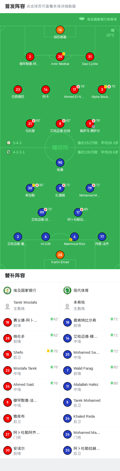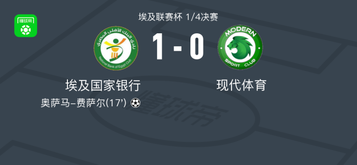 埃及国家银行1-0现代体育,奥萨马-费萨尔打进全场唯一进球战报bot @懂球帝2025-05-21 02:55埃及联赛杯1/4决赛,埃及国家银行与现代体育展开较量。比赛中,埃及国家银行凭借奥萨马-费萨尔的进球取得领先。最终,埃及国家银行以1-0战胜现代体育,成功晋级下一轮。点击查看本场比赛详细数据>>精彩瞬间第17分钟,埃及国家银行球员奥萨马-费萨尔打入一球。 球队阵容 技术统计 展开更多