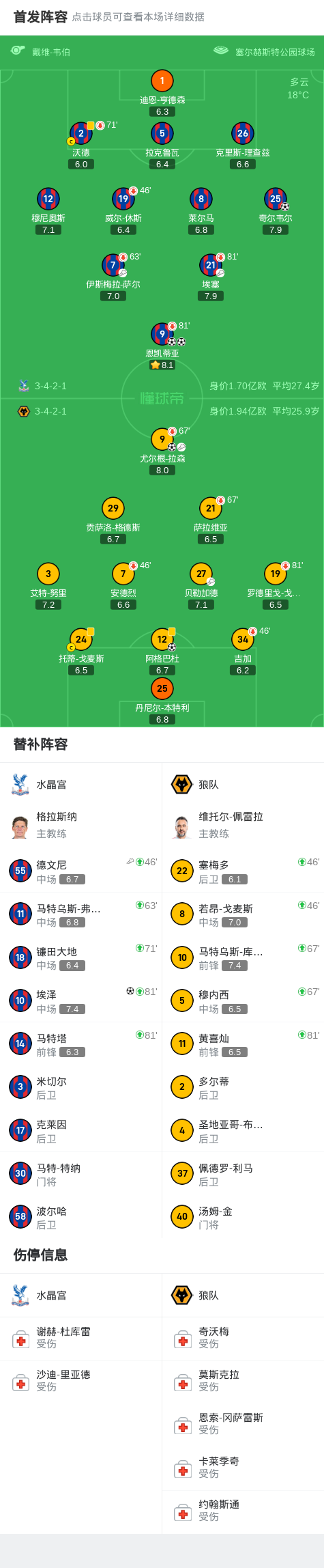 英格兰足球顶级联赛第37轮,水晶宫主场迎战狼队。比赛中,水晶宫的恩凯蒂亚表现出色完成梅开二度,奇尔韦尔与埃泽各打入一球。狼队方面,阿格巴杜取得进球,尤尔根-拉森也为球队建功。最终,水晶宫以4-2战胜狼队。