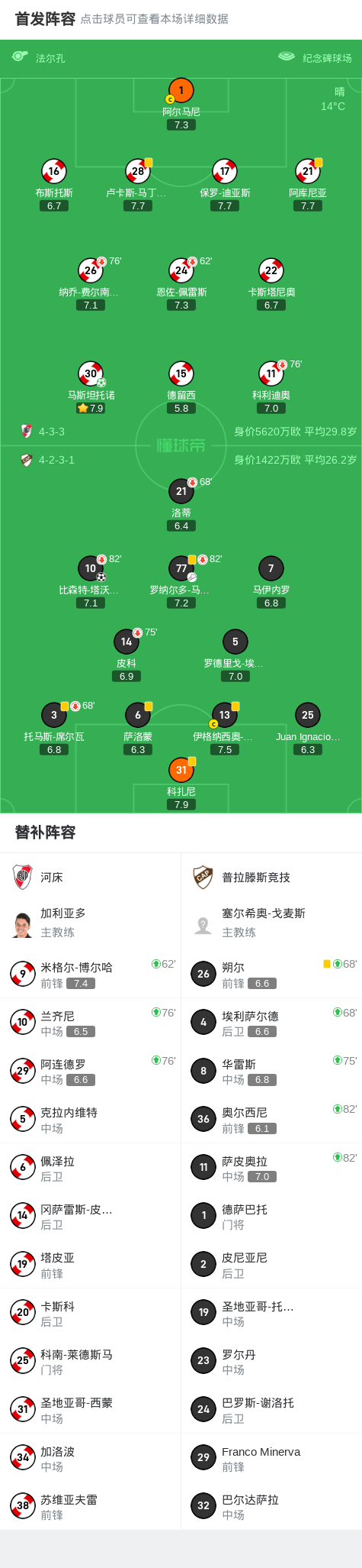 北京时间5月21日阿根廷足球超级联赛 春季1/4决赛,河床主场对阵普拉滕斯竞技。河床马斯坦托诺破门。普拉滕斯竞技比森特-塔沃尔达破门。最终比分河床 3-5 普拉滕斯竞技。