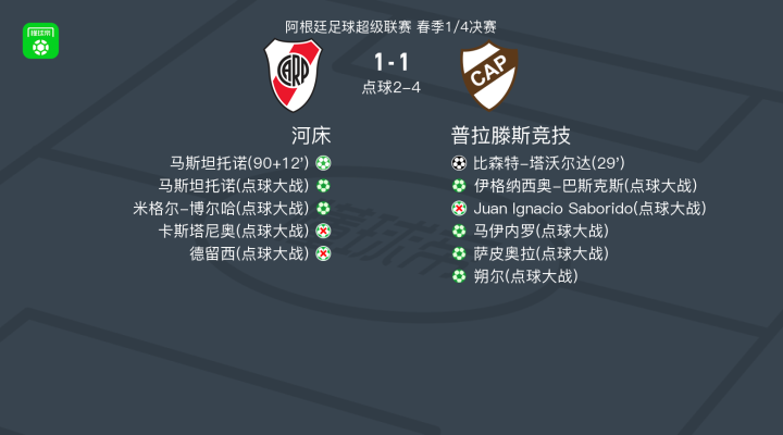 点球大战普拉滕斯竞技5-3河床,德留西失点