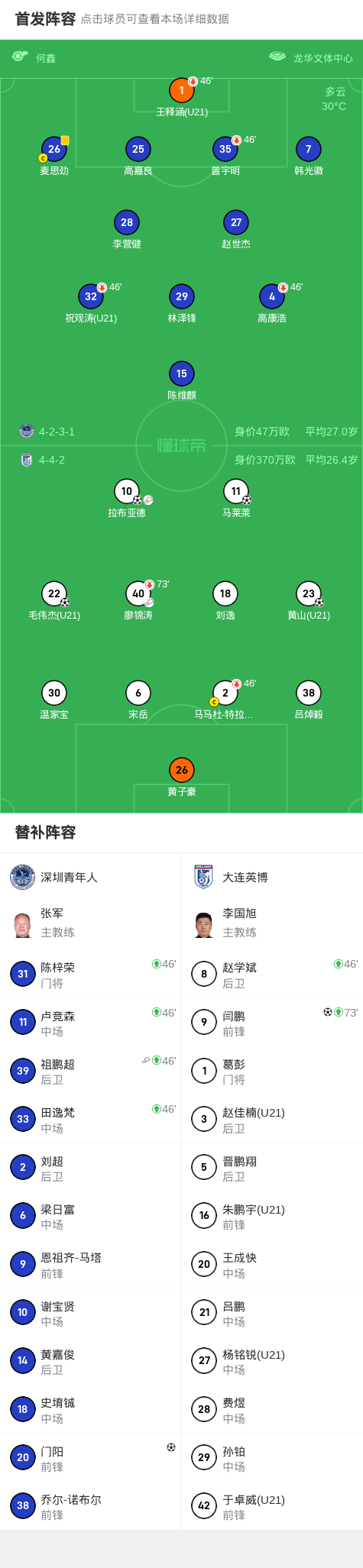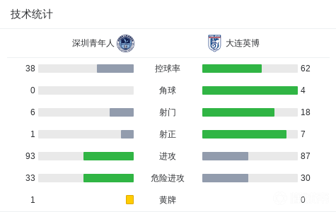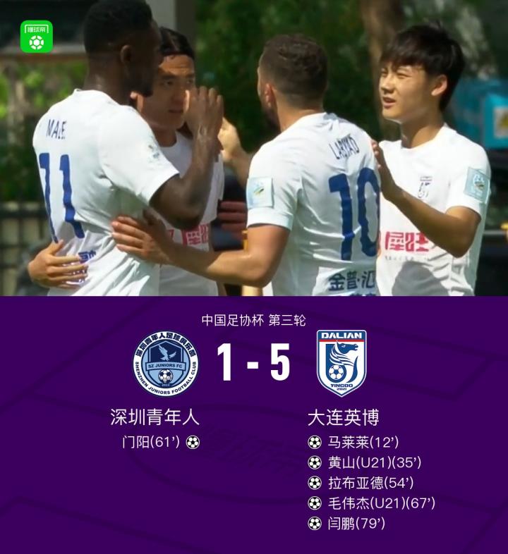 北京时间5月21日中国足协杯第三轮,深圳青年人对阵大连英博。上半场廖锦涛抢断王释涵的传球,随后助攻马莱莱破门,之后拉布亚德送助攻,黄山斩获个人职业生涯处子球。下半场马莱莱长传,拉布亚德内切兜射破门,随后门阳头球破门扳回一球,之后毛伟杰扣过防守,随后冷静推远角破门,之后赵学斌长传,闫鹏单刀破门。最终英博5-1战胜青年人晋级下一轮。