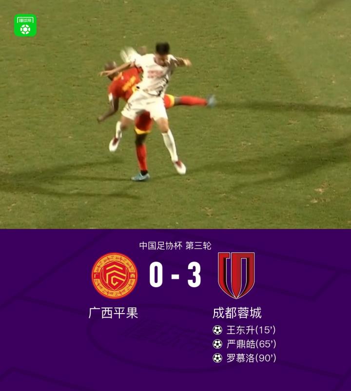 北京时间5月21日,中国足协杯第三轮,广西平果对阵成都蓉城。比赛中,王东升接队友助攻率先破门,为球队打开胜利之门。随后,严鼎皓打入一球扩大领先优势。比赛尾声阶段,罗慕洛锦上添花再入一球。最终,广西平果以0-3不敌成都蓉城。