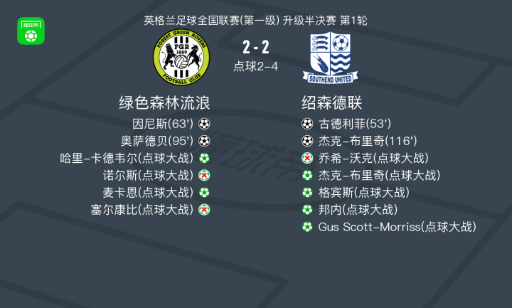 北京时间5月22日英格兰足球全国联赛(第一级) 升级半决赛 第1轮,绿色森林流浪主场对阵绍森德联。绿色森林流浪因尼斯破门,奥萨德贝破门。绍森德联古德利菲破门,杰克-布里奇破门。最终比分绿色森林流浪 4-6 绍森德联。