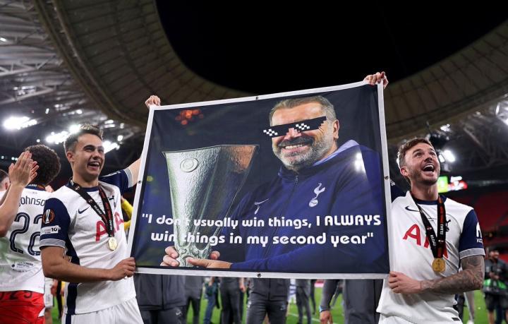赛后,热刺球员麦迪逊和雷吉隆举起了印有波斯特科格鲁捧着欧联冠军奖杯的旗帜,上面写着波斯特科格鲁之前说过的那句话。