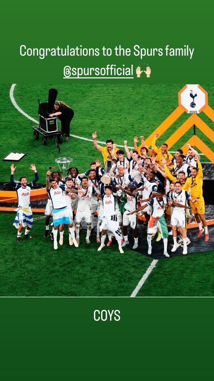 在热刺夺得2024-25赛季欧联杯冠军后,前主帅波切蒂诺通过社交媒体送上祝贺。