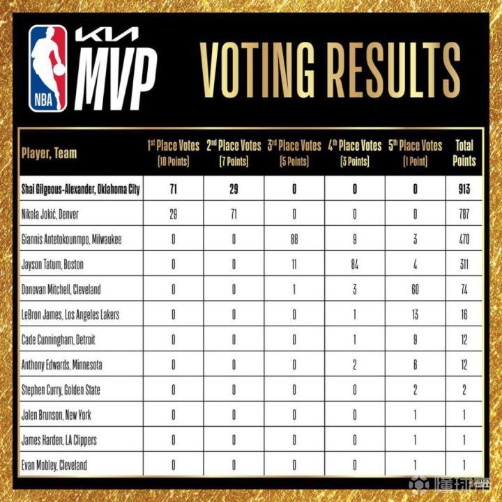 MVP选票详情:亚历山大第1,约基奇第2,詹库分列69
