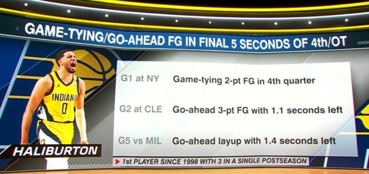 哈利伯顿单赛季季后赛4次绝平、绝杀或准绝杀,与雷-阿伦并列历史第一