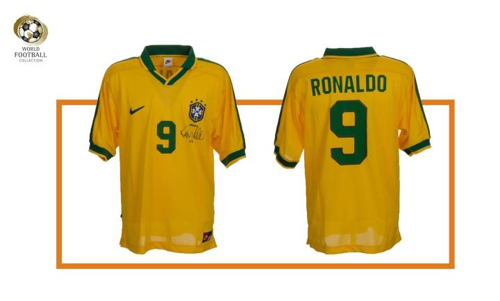▲1997年美洲杯巴西队9号球衣,罗纳尔多亲笔签名后收录在世界足球博物馆内。