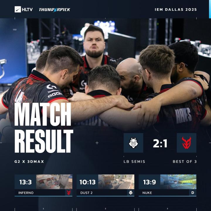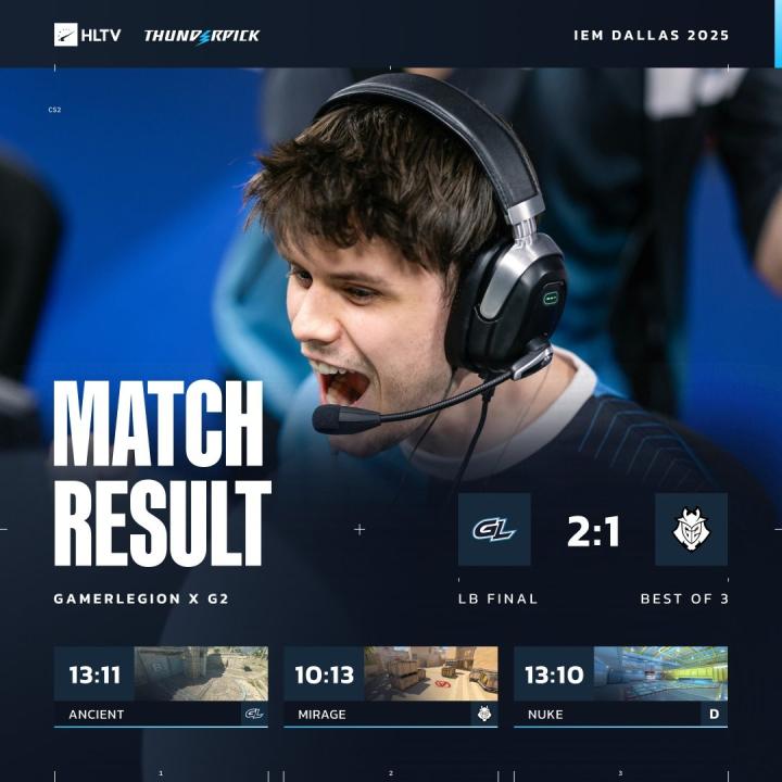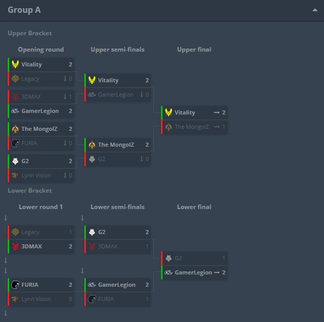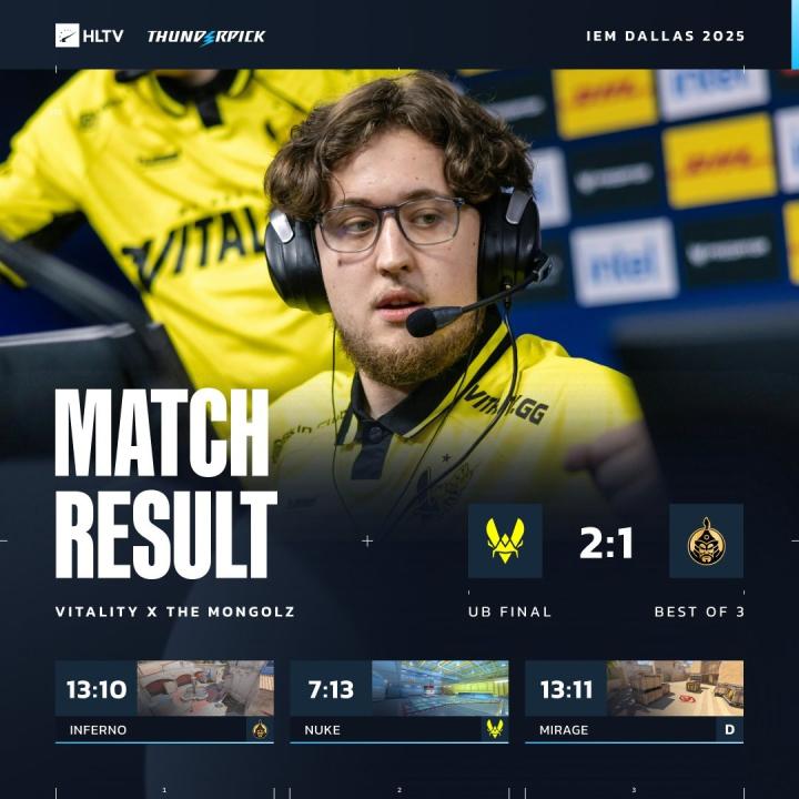在IEM达拉斯站小组赛最后一个比赛日中,Vitality击败蒙古队延续连胜成为A组第1,G2则在败者组中负于GL,无缘Playoff。