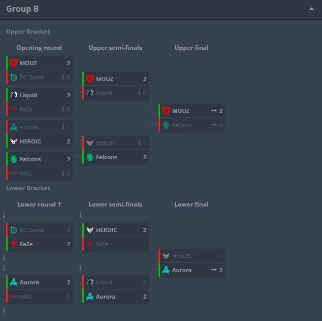 “动物园内战”中MOUZ力克猎鹰成为B组头名,Aurora击败HEROIC从败者组杀出重围。