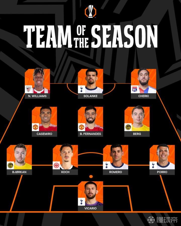 2024-25赛季欧联杯落幕,欧联杯官方公布了本赛季最佳阵容,热刺4人入选,布鲁诺-费尔南德斯、卡塞米罗在列。