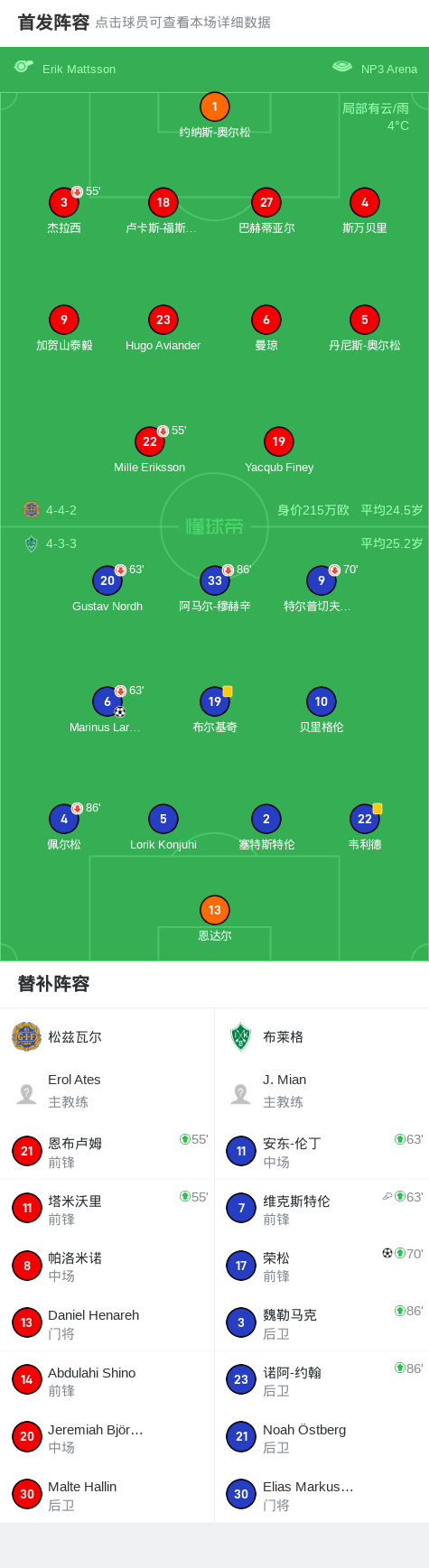 北京时间5月23日,瑞典足球甲级联赛第9轮,松兹瓦尔主场迎战布莱格。比赛中,布莱格由Marinus Larsen率先取得进球,随后荣松再入一球锁定胜局。最终,松兹瓦尔0-2不敌布莱格。