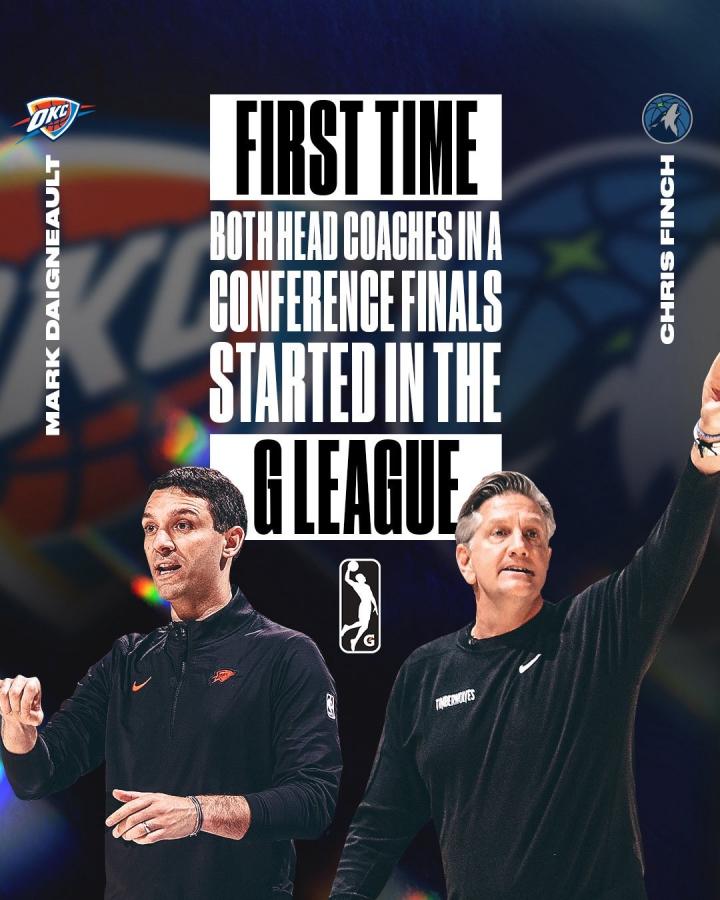 值得一提的是,雷霆队和森林狼队主帅戴格诺特和芬奇都是在NBA G联盟执教,如今二人带着各自的球队在西部决赛中相遇。据统计,这也是首对在G联盟开启执教生涯之后又在西决相遇的教练。