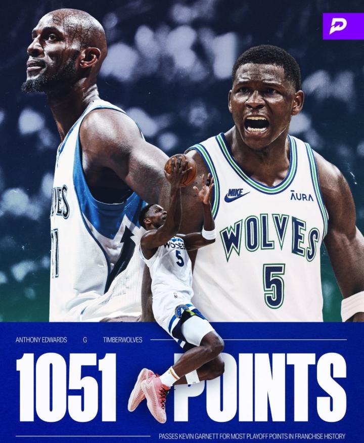安东尼-爱德华兹已经超越凯文-加内特,成为明尼苏达森林狼队季后赛历史得分王。
