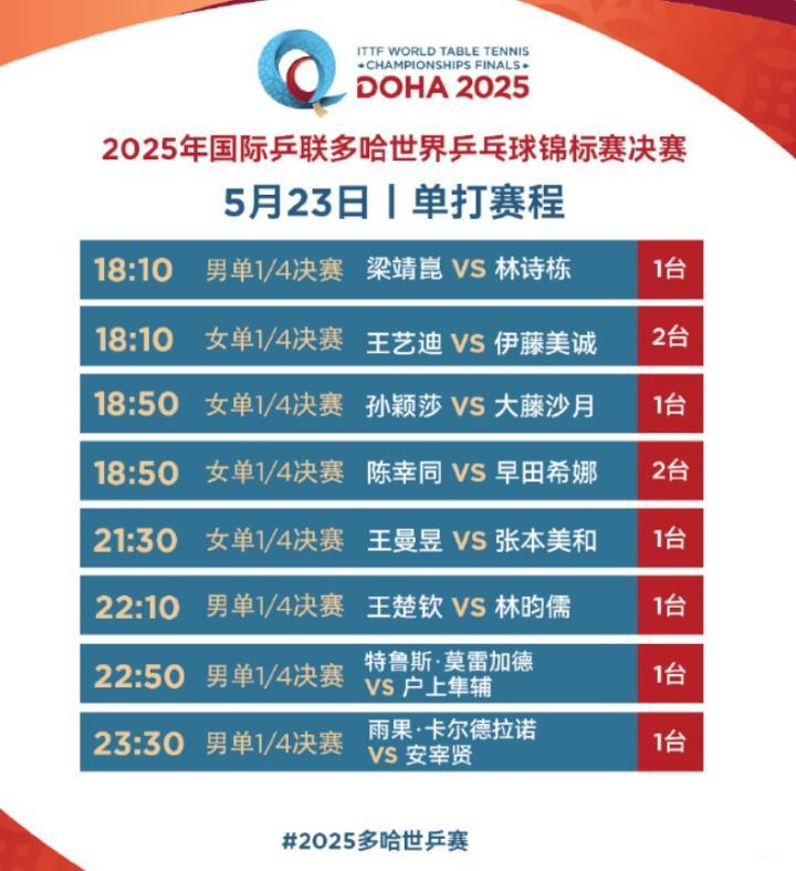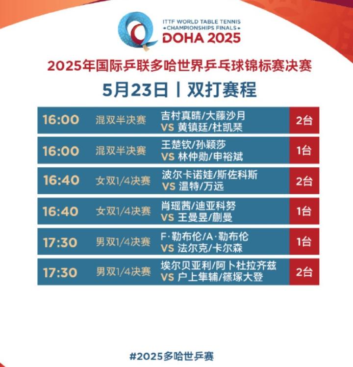 北京时间5月23日,多哈世乒赛今日赛程出炉,国乒队员王楚钦、孙颖莎、王曼昱将双线出战。