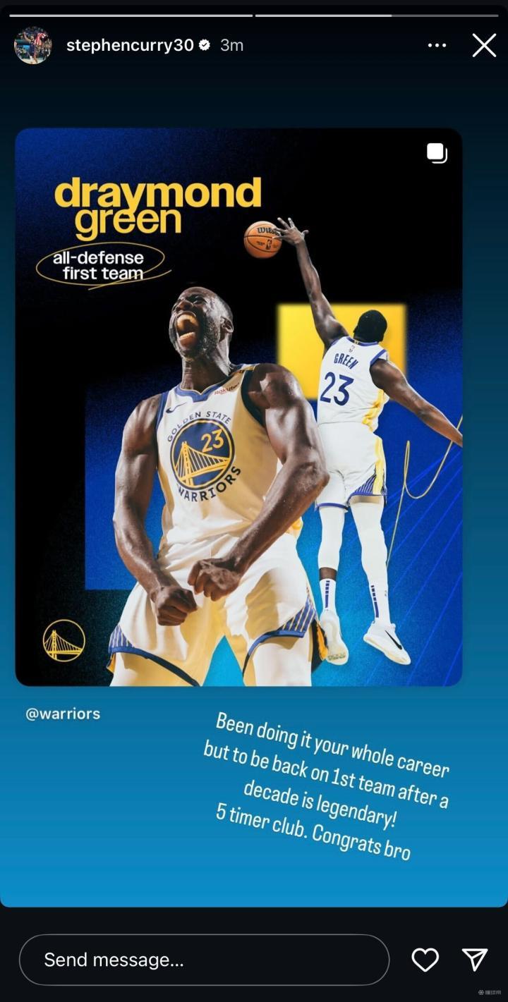 在结果公布之后,勇士队当家球星库里第一时间更新社媒,恭喜了自己的老队友追梦。库里写道:“你整个职业生涯都在做这件事,但在距离首次入选最佳防守一阵十年后仍能入选最佳防守一阵真的非常传奇!五次最佳防守一阵,恭喜你兄弟。”