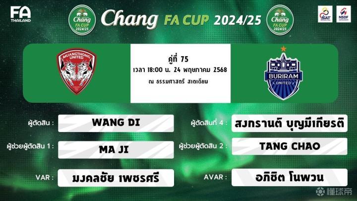 本届泰国足总杯决赛的对阵双方是蒙通联和武里南联队,两队将于当地时间5月24日下午六点在法政体育场展开对决。执法本场比赛的裁判是中国籍裁判王迪。